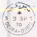 These cancels were used in Dubai and in Deira from mid-1965 to 1972, and from an unknown date from the International Airport. These cancels were used also for a time when Dubai joined the UAE. My thanks to R. Howard Courtney for the photocopies of these cancels and for the earliest known used dates for the first three Dubai cancels. My thanks to Khalid al-Omaira for the first Deira and for the International Airport cancels and the earliest known used dates of the three Deira cancels and the International Airport cancel.