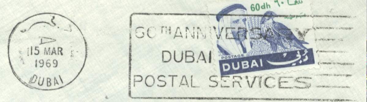 The several varieties of the small single ring with bars cancels were used from 1969 - 1972. The 60th Anniversary of Dubai Postal Services slogan cancel exists in both Arabic and English. I am still checking to see if the slogan cancel was use only during 1969. My thanks to R. Howard Courtney for the photocopies of the two English language Dubai slogan cancels and the first Dubai Postal Cancel.three cancels. My thanks to Khalid al-Omaira for the current images of the cancels and the earliest known dates of use (EKU). The A and B cancels were used in both Dubai and Deira. The B cancel has been seen used from a Riqa address. Still checking for types.
