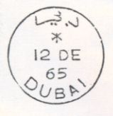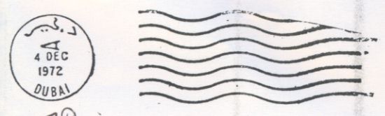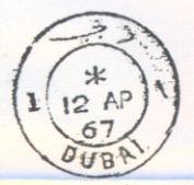 There were four basic types of cancels: a small and a large single ring cancels, a small double ring cancel and a small ring and bar cancel. There also was a commemorative cancel in English or in Arabic. My thanks to R. Howard Courtney for supplying the photocopies of these images and to Khalid al-Omaira for the images of several other Dubai cancels.
