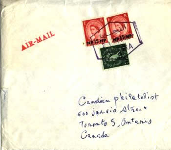 The cover paid the 40 naye paise airmail (printed matter?) rate from Fujairah to Canada. I have also seen 20 naye paise (two 5 np and one 10 np) rated covers to Great Britain, as well as two other 40 nay paise rated airmail covers to the United States and to Argentina. The date on the cancel is to 21 Aug 1964. I have also seen covers dated 20 Aug 1964. The cover is franked with two 15 naye paise and one 10 naye paise overprinted stamps from the British Post Offices in Eastern Arabia series. Unlike the Michel Stephen proposed stamps, these stamps do not have "Fujairah" overprinted on them. The hexagonal cancel would seem to indicate that the Fujairah cover was sent by J & H Stolow Inc. and may have included an announcement of the first series to be issued by Fujairah. The service was a fulfillment of part of their 1964 contract with both the Fujairah and the British Governments to publicize the stamps of Fujairah.