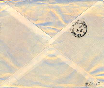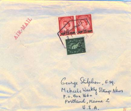 The cover paid the 40 naye paise air mail (printed matter?) rate from Fujairah to the United States. I have also seen 20 naye paise (two 5 np and one 10 np) rated covers to Great Britain. The date on the cancel appears to be 21 Aug 1964. I have also seen covers dated 20 Aug 1964. The cover is franked with one 10 naye paise and two 15 naye paise overprinted stamps from the British Post Offices in Eastern Arabia series. Unlike the Michel Stephen proposed stamps, these stamps do not have "Fujairah" overprinted on them. The hexagonal cancel would seem to indicate that the Fujairah cover was sent by J & H Stolow Inc. and may have included an announcement of the first series to be issued by Fujairah. The service was a fulfillment of part of their 1964 contract with both the Fujairah and the British Governments to publicize the stamps of Fujairah.