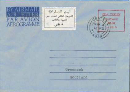 The label is used on a PDRY provisional aerogramme (Wiegand #106) and was mailed to New York from Crater on 12 February. Note that the label was not postmarked. The label has a straight edge on the bottom. There aslo seem to be a difference in the perforations. Whether this is due to my scanning this aerogramme or because it is from a different printing is unknown to me at this time.